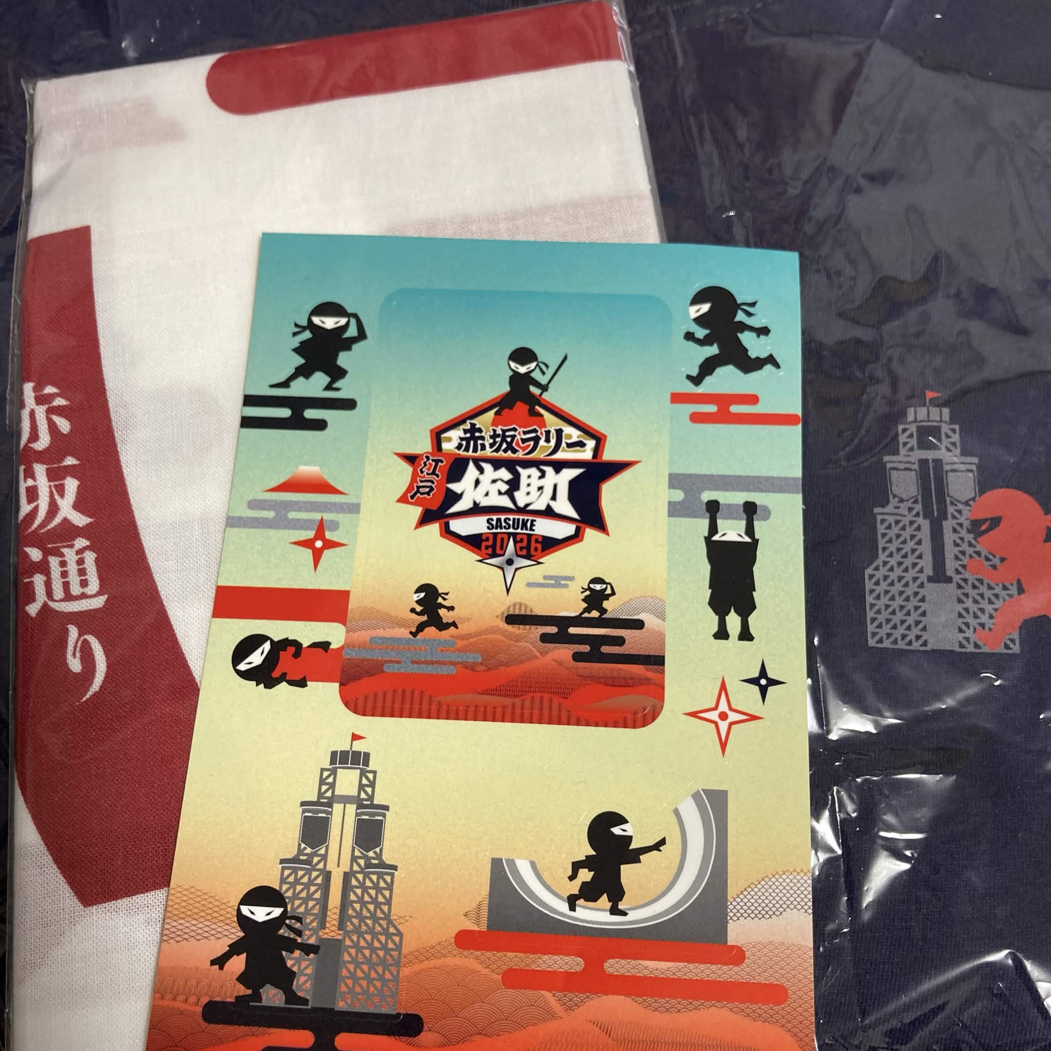 手ぬぐいは赤色と青色、TシャツはLサイズとSサイズからそれぞれ選べます。